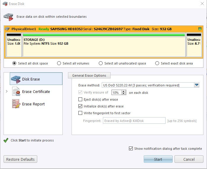 Erase Disk In Erase Disk’s General Options, we can choose our erasure method and we have checkboxes for: ejecting disk(s) after erase, initializing the disk(s) after erase and write fingerprint to the first sector. Ejecting disk(s) after erase - does what it says it does. Initialize disk(s) after erase - means that after the disk has been deleted it will be formatted and ready for further use. Write fingerprint – a certain fingerprint will be written in the first sector which will be shown on the screen once the computer was booted from it. You can mention the person responsible for the erasure, date when it was performed, a tool used, etc. The limit is 256 symbols.