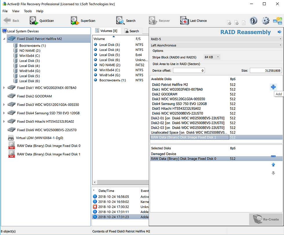 File Recovery identifies the RAID disk images and after adding them we will click on Re-Create to remake the damaged system.